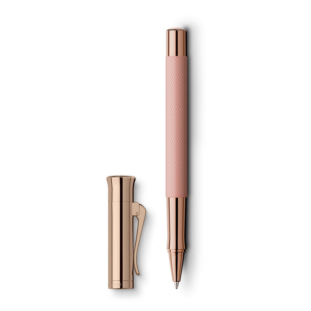 Wie perlmuttschimmernde Preziosen präsentieren sich Füllfederhalter, Tintenroller und Drehkugelschreiber: Der in sanftem Rosé gehaltene Edelharzschaft wird durch Metallteile mit einer edlen, hochglänzenden 18-Karat Roségold-Beschichtung komplettiert – das Ergebnis ist eine ebenso emotionale wie elegante Farbkombination, die das Spiel von Rosé zwischen Romantik und Raffinesse wunderbar widerspiegelt.