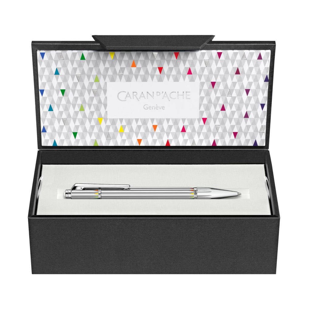 • Kappe versilbert und rhodiniert, Lasergravur des Caran d'Ache-Logos auf dem Druckknopf