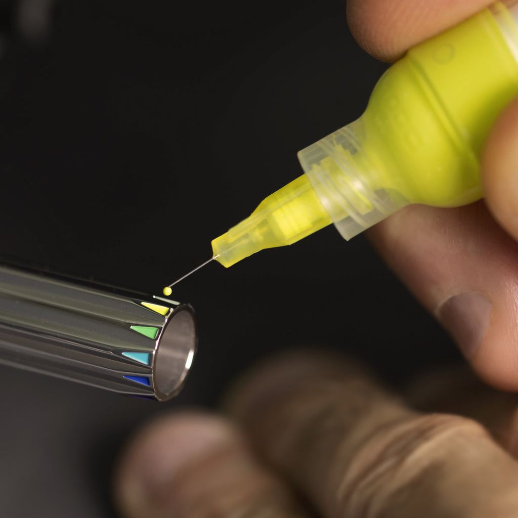 • Körper und Kappe mit Uhrmacher-Guillochierung mit Kronen-Effekt: Facettierter Zylinder mit feinen, gravierten und anschließend in den Farben des Farbkreises von Caran d'Ache lackierten Dreiecken