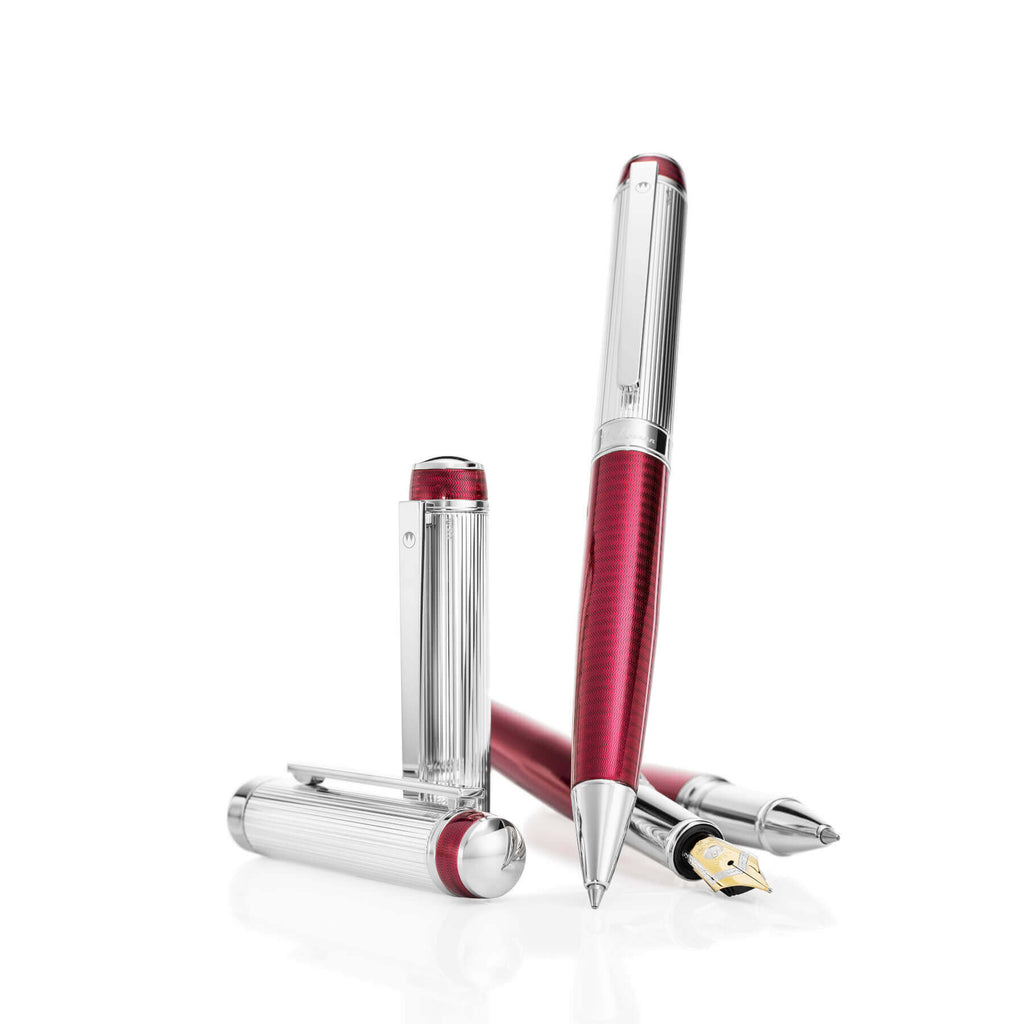 • Schaft und Kopfring aus massivem Sterlingsilber mit guillochiertem Silhouette-Dekor, mehrschichtige Transparentlackierung in burgundrot