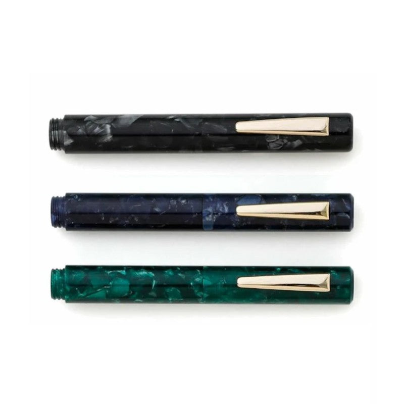 Füllfederhalter mit wunderschönem Marmormuster. Die feine (F) Feder am Acrylschaft, die je nach Winkel ihren Ausdruck verändert, ist mit einer 24-Karat-Goldbeschichtung versehen und sorgt so für ein angenehmes Schreibgefühl. Die kurze Größe mit Clip erleichtert das Tragen. Der Füllfederhalter wird in einer Geschenkbox geliefert.