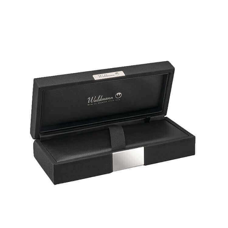 Mit seiner Kollektion EDELFEDER ist Waldmann seiner Formsprache, Materialauswahl und Qualität treu geblieben. Der Korpus ist aus Metall und die Kappe aus massivem 925er Sterlingsilber. Dieses hochwertige Material ist Kennzeichen fast aller Modelle aus dem Hause Waldmann. Hier wird es für die Kappe fein guillochiert und beim Körper mit einer hochglänzenden Brillantlackierung überzogen.