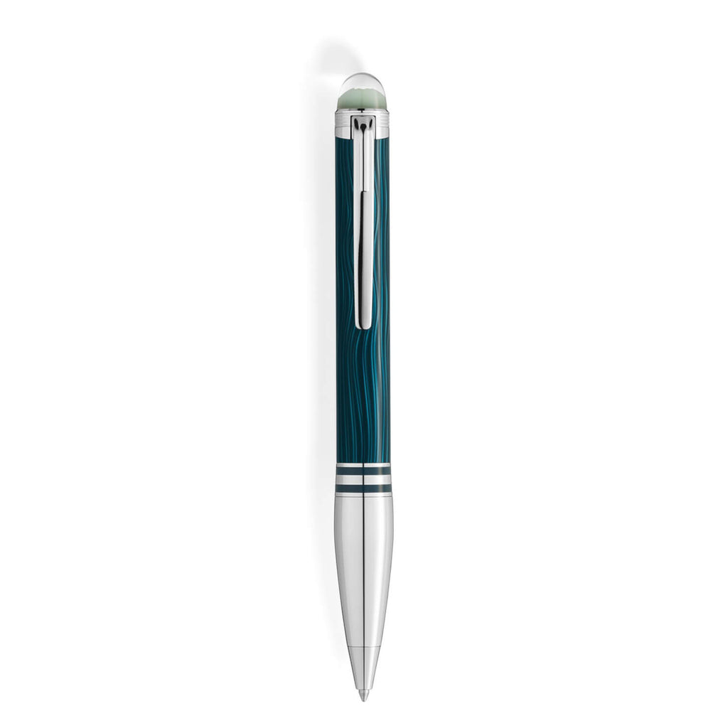 Die Kuppel auf der Kappe besteht aus transparentem Harz und leuchtet bei schwachem Licht, was an die bezaubernden tanzenden Polarlichter am Nachthimmel erinnert. Das Guilloche-Muster auf dem Korpus fängt den spektralen Glanz der Lichter auf bewundernswerte Weise ein, und die dunkelgrüne Lackierung betont die passenden Reflexionen. Die dunkelgrünen Harzringe des Vorderteils betonen die platinierten Beschläge des Kugelschreibers.